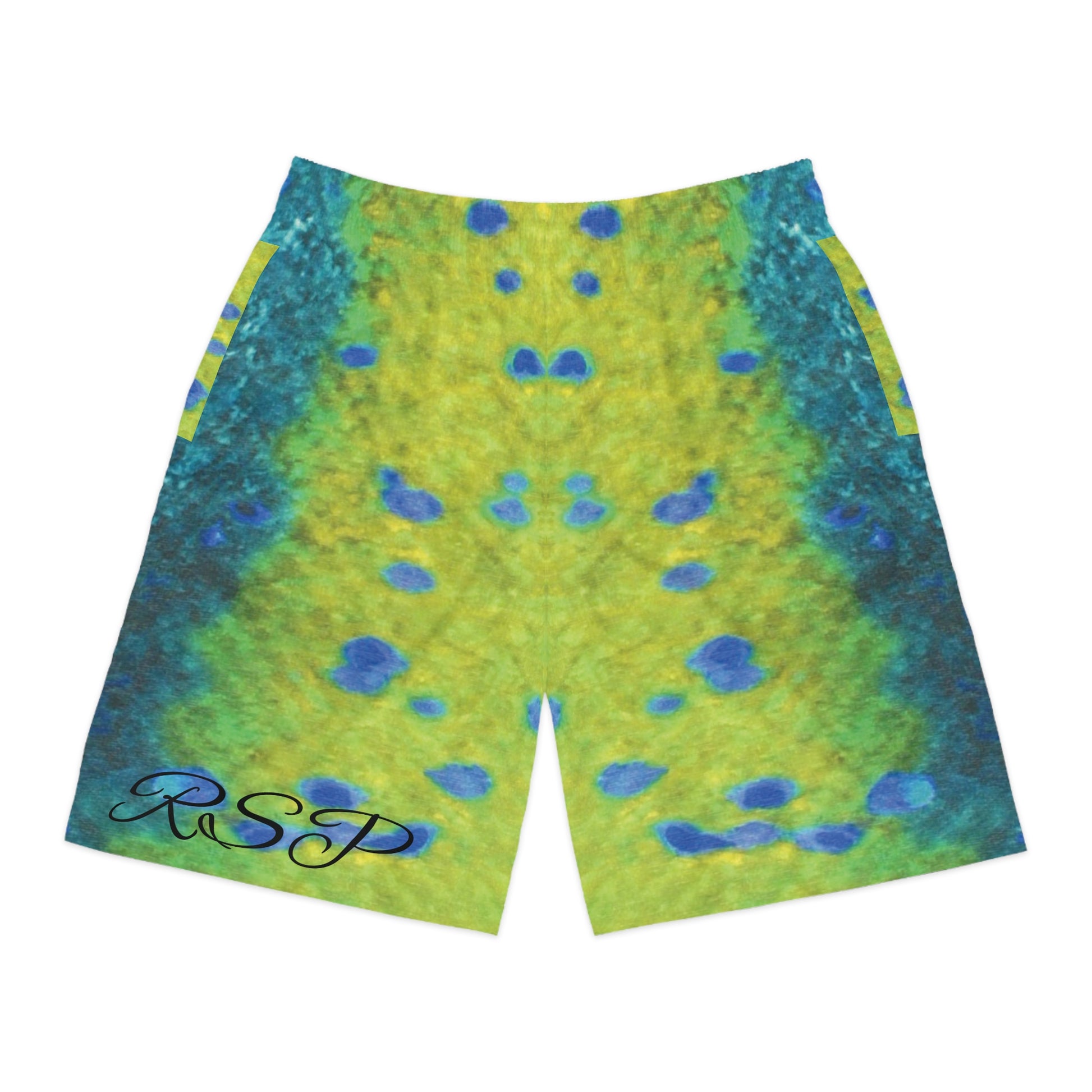 These vibrant jogger shorts bring bright, aquatic energy to easygoing days. Lightweight and quick-drying, they feel breezy against skin and move with you—whether you’re pacing the boardwalk, diving into a spontaneous swim, or lounging at home. The all-over, painterly pattern blends sunlit chartreuse with ocean blues for a lively, hand-painted look. Practical details keep the pace casual: a soft elastic waistband with drawstring, roomy side-slit pockets plus a secure back pocket with Velcro, and a loose cut that layers comfortably over swimwear or tees. Small signature script at the hem adds an artist’s touch. Wear them when you want color, comfort, and an effortless coastal vibe.