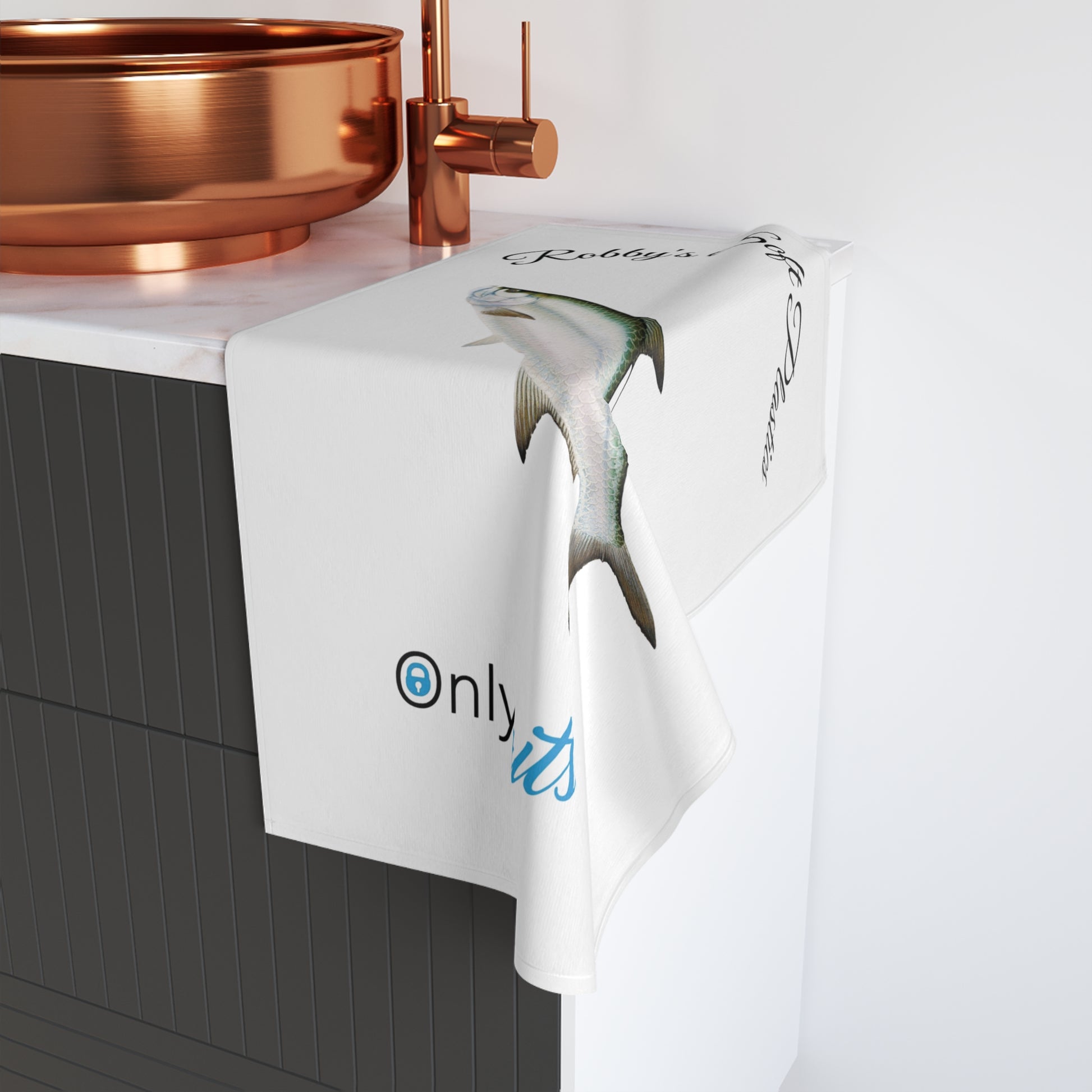 A lightweight, soft hand towel printed with a realistic baitfish illustration and subtle brand lettering. The neutral white background keeps the artwork crisp, while the smooth fabric absorbs water quickly and dries fast after use. This towel brings a slice of the shoreline to your kitchen, bait station, or tackle corner—use it to pat down hands after a cast, polish reels, or wipe up quick spills without hiding the artwork. It feels gentle on skin and maintains vibrant print clarity wash after wash, so the fish and script stay sharp through seasons of use.