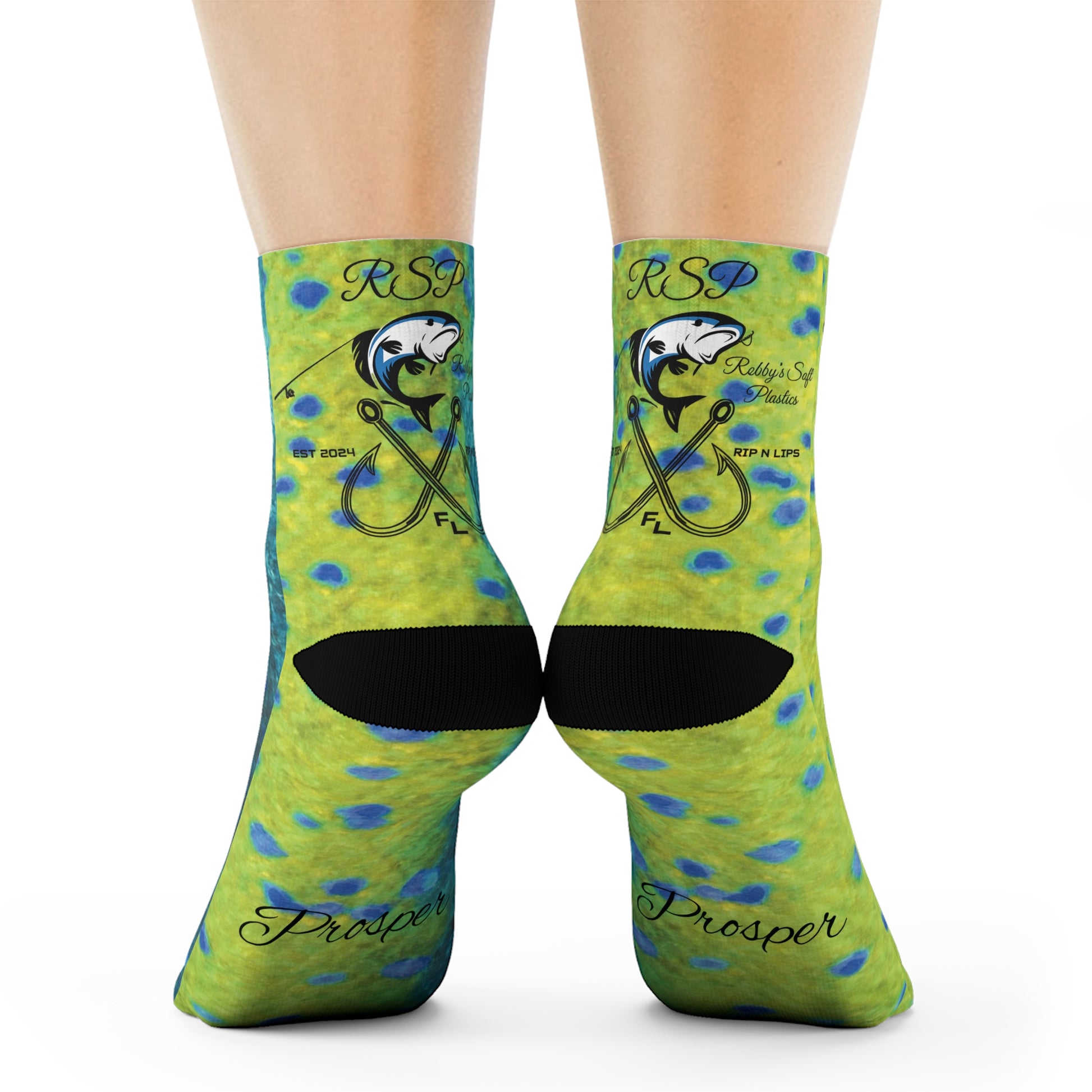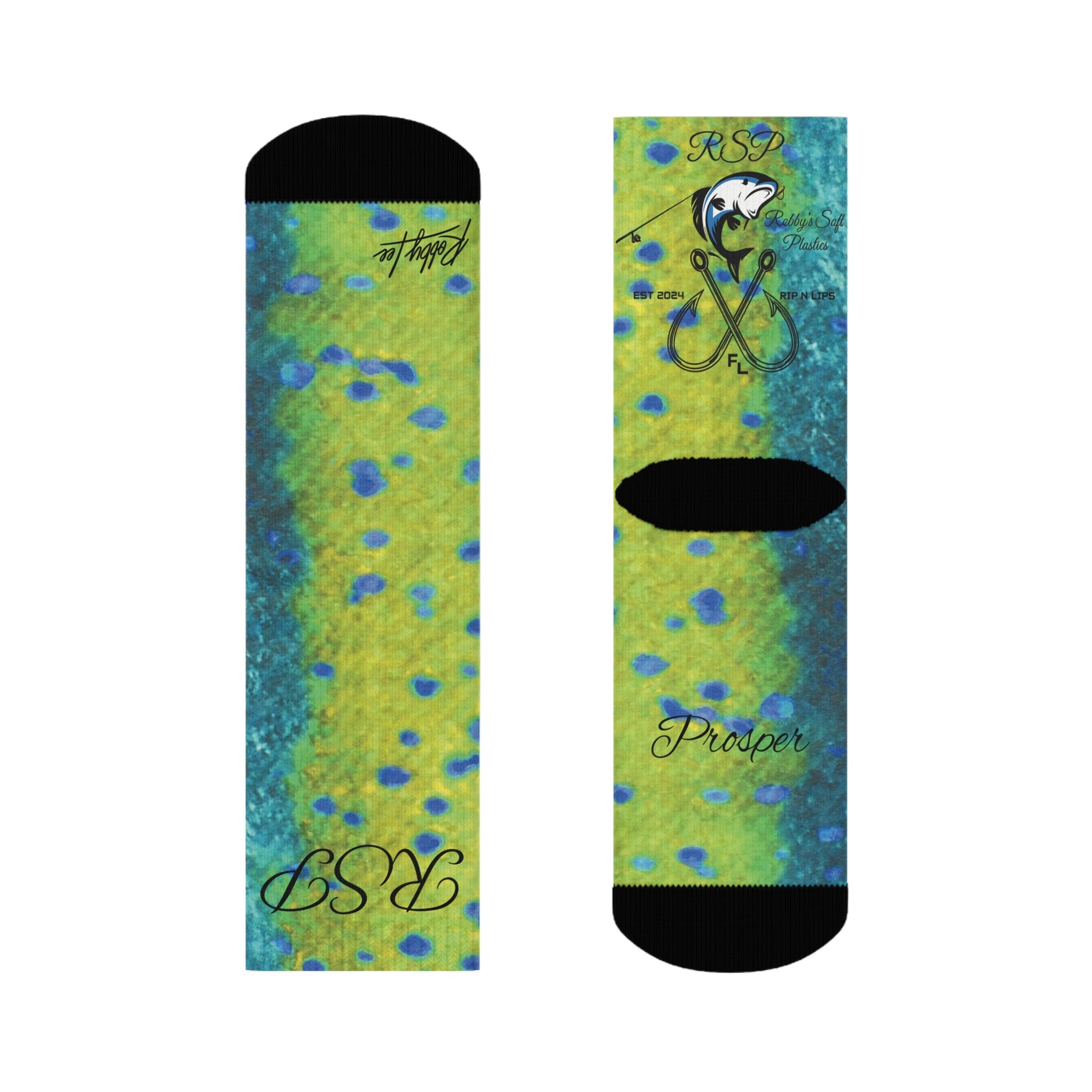 These crew socks bring a splash of sea-washed color to everyday wear. The bright teal-to-lime gradient, flecked with deep blue spots, feels like sunlight hitting shallow water. Scripted words and a small crest peek through the pattern for a subtly nautical, handmade vibe. Cushioned bottoms keep steps soft while the seamless toe and contrast black heel and toe add refined comfort. Lightweight polyester holds the print’s vivid tones and dries quickly after a long day on the move. Slip them on with shorts or rolled jeans and let the color carry you through long walks, coastal weekend mornings, or relaxed studio sessions.